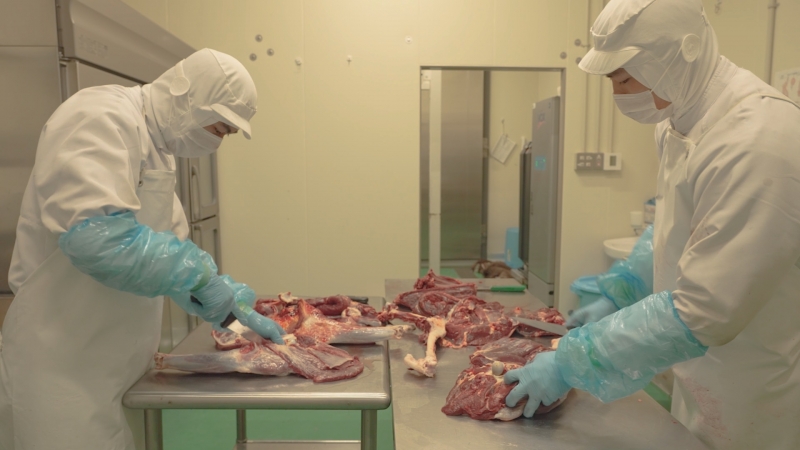 通常は各猟師さんが処理場に持ち込むが、栄肉は持ち込み個体が無い鹿と猪による農作物被害を減らすと同時に、いただいた命を美味しくいただく絞め(放血)から精肉までの処理を統一する事により、衛生的かつ肉質が安定しています。