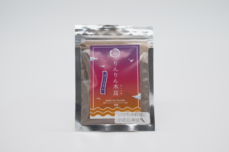 原材料のきくらげには、森産業株式会社で開発された、純国産菌床アラゲキクラゲ森89号を使用しています。栽培はハウスで行い、無農薬で江田島の陀峯山の地下水を使用しています。きくらげの栽培には、水の適切な管理が不可欠です。そのため、灌水設備を完備し、夜間にも自動ミスト散水を行う等、丁寧に栽培しています。