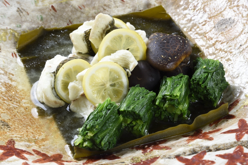器に昆布を敷き、先程の黒鯛を盛り付けレモンの輪切りを多めにのせ椎茸、春菊などをあしらう。