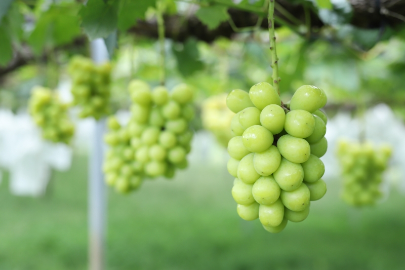 シャインマスカットは、大粒の日本人好みの食味で、皮ごと食べられるうえ、口の中でパツンと皮を噛んだときに広がる甘い果汁がたまらない。2006年に品種登録されて以来、急速に人気が広まったことはよく知られている。同農園もこの品種は、種なし栽培をしているので、贈答用としても喜ばれるほか、生菓子のデコレーションにも使いやすい。