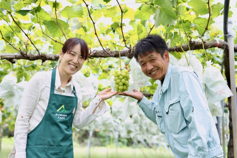 それでも直接販売だから対応できることもある。農園主の久保田一夫さんは「これが常連のお客様が好きなシャインマスカットです」と言って、一房持ってきてくださった。何が違うのかというと、シャインマスカットの粒の色。店頭や贈答品のカタログでよく見るものより、全体的にやや黄色がかっている。実はシャインマスカットは、収穫後1日ごとに酸が抜けていく。ブドウには、もともとある程度の糖度と酸度はあるものだが、糖度が高いシャインマスカットから酸が抜けるということは、ぐ~んと糖度が強く感じられるようになるということだ。つまり黄色がかっている方が甘い。ところが酸が抜けると傷みやすいということもあり、市場では黄色がかったシャインマスカットは評価が低いのだという。さすが常連のお客様になると、久和田農園のこだわりシャインマスカットの中でも、より美味しい房はどれか、ちゃんと心得ていらっしゃる! 美味しければすぐ食べてしまうので、日持ちがする必要はないというわけだ。