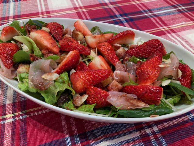 - 器にリーフ類・生ハム・レーズン・スライスアーモンド・クルトン・いちごをのせ、