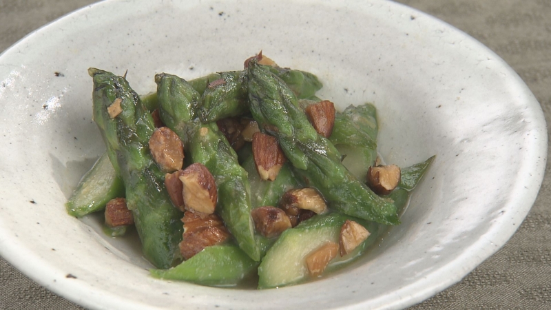 - アスパラガスは太目の斜め切りにして、アーモンドと味噌ダレを適量入れて和えて完成