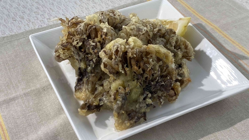 - 180度に熱した油に、衣をつけたマイタケを入れて揚げる。