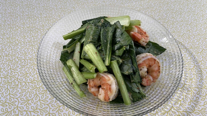 カットした小松菜とエビを入れてドレッシングを良く合わせる。