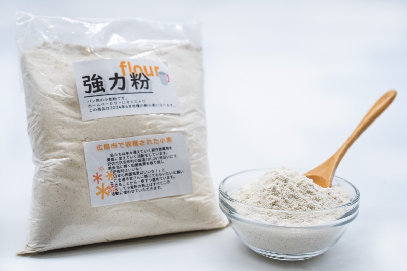 広島県広島市安佐北区で育てられた小麦粉は、地元の気候と土壌の影響を受け、独特の風味と香りを持っています。安佐町には休耕田が100haあると言われています。その一部を再活用し、初夏に黄金に輝く麦秋の景色にするという活動によって作られた小麦粉です。売上の一部をこの活動に使わせていただいてますので、小麦粉を買っていただくことによって 中山間地域の景色が良くなっていきます。また地元の清和中学校の生徒さんと 栽培を協力しており、食育の一環にもなっております。
