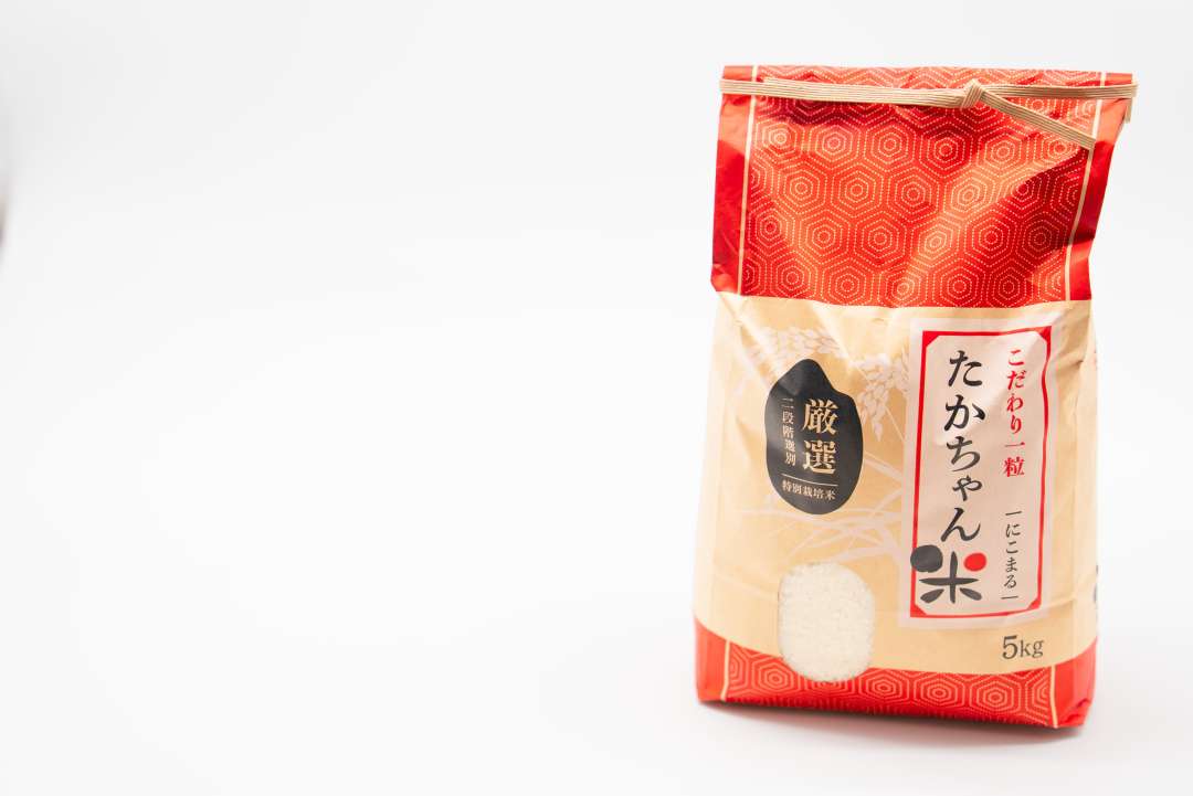 特別栽培米として安心安全を追求して育てています。食べた人が笑顔になるおいしいお米です。パッケージは赤を基調にしており、他社のお米の袋とは一味違います。