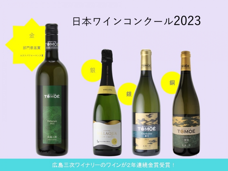 国産ぶどうを100%使用した「日本ワイン」を対象とした国内唯一のコンクール、「日本ワインコンクール2023」で、「株式会社広島三次ワイナリー」のワインが、2年連続で金賞に輝きました。その他、銀賞、銅賞、奨励賞を含め、計6本が受賞されました。